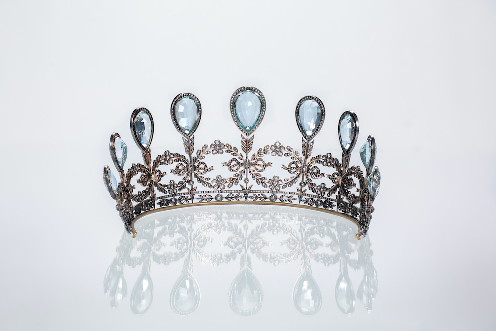 There’s no missing this sizable aquamarine and diamond tiara – a token of love from Frederick Francis IV, Grand Duke of Mecklenburg-Schwerin to his bride on their wedding day. The diamond Cupid’s arrows point down to inspire love to bloom in her mind.