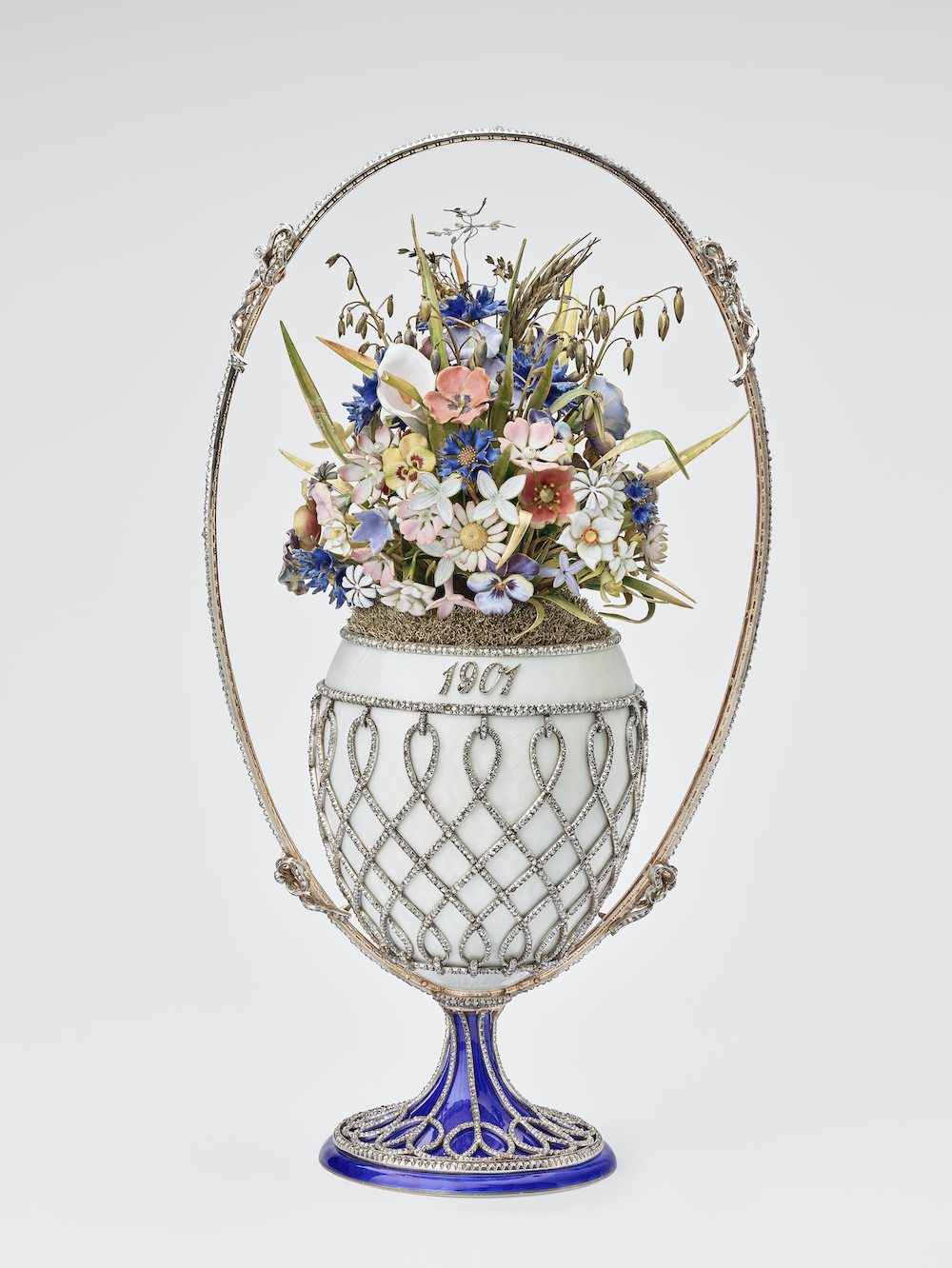 This recently discovered Third Imperial Egg of 1887 was found by a scrap dealer in 2011. It had been lost for many years, and was bought for gold at a Midwest flea market when the buyer realised it looked like a Fabergé and contacted Wartski. The yellow-gold egg stands on a lion paw feet and is encircled by gold garlands with sapphires set with rose diamond bows.