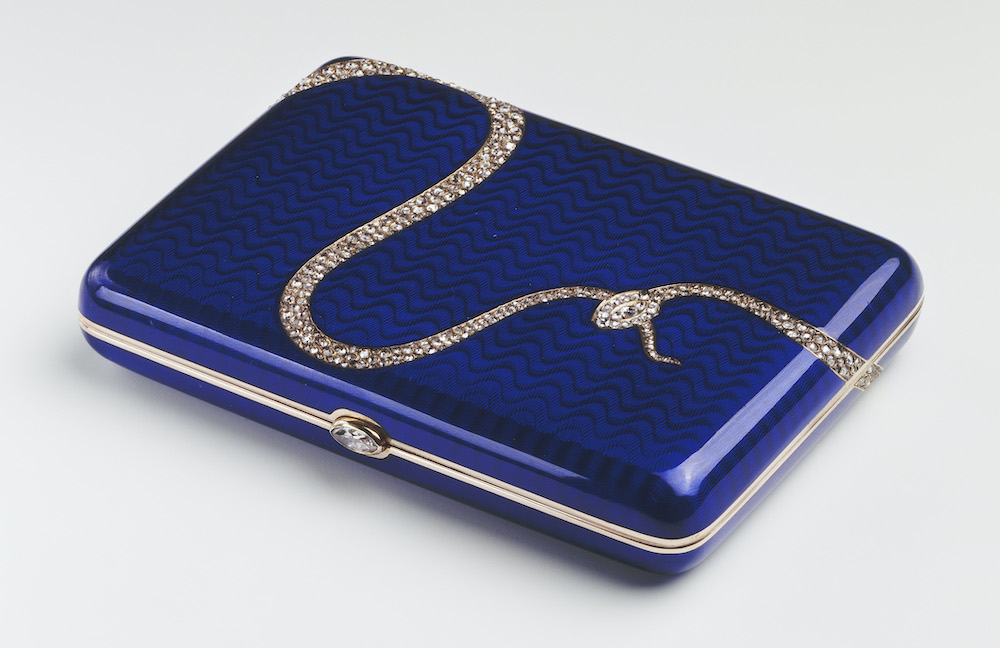This cigarette case was given by King Edward to his mistress Mrs George Keppel with a snake laid in diamonds biting its tail – a cheeky symbol of unbroken love.