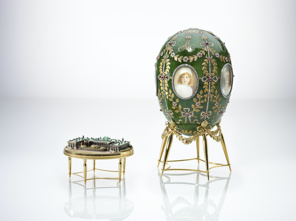 The exhibition concludes with a room that displays 15 of Fabergé’s iconic Imperial Easter Eggs, the largest collection on public display for 25 years. They each contain a Kinder-egg style surprise inside. This Alexander Palace Egg features a miniature model of the palace inside.