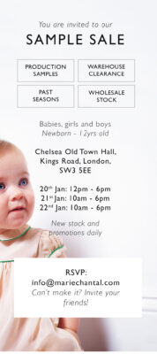 The sale is on 20th January from 12pm to 6pm, and 21st and 22nd January from 10am – 6pm, at Chelsea Old Town Hall. If you’d like to go, do RSVP at info@mariechantal.com.