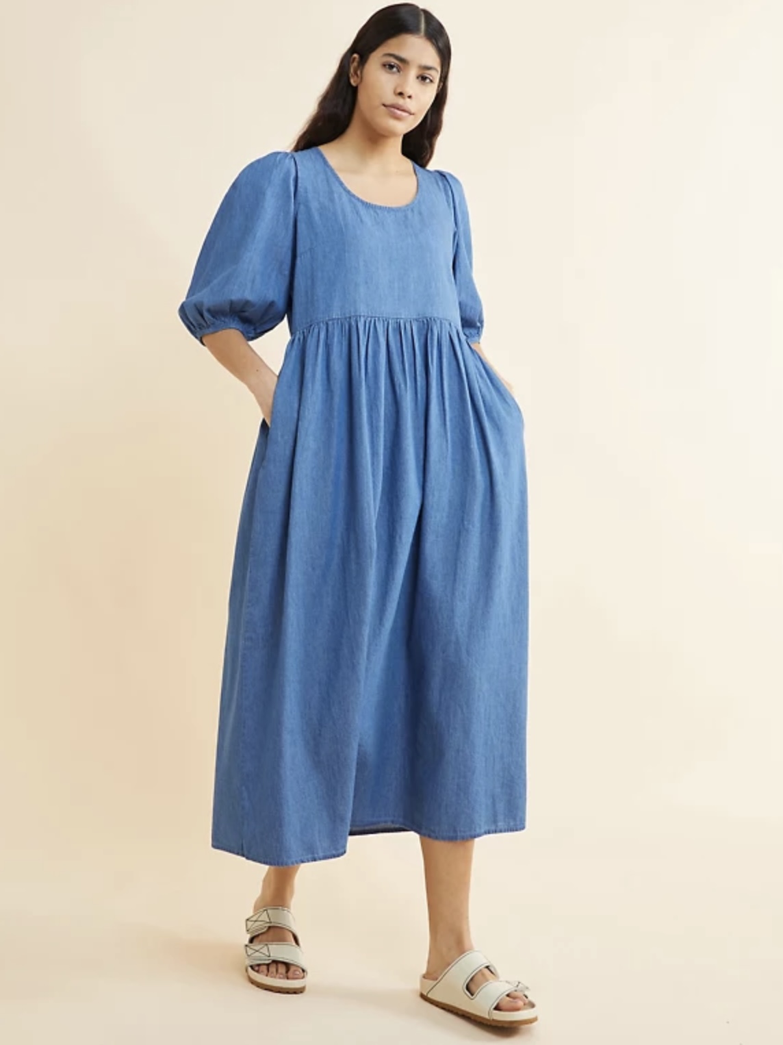 We love how the tulip detail and white frill on the collar make this denim dress from Rixo just a little bit different.