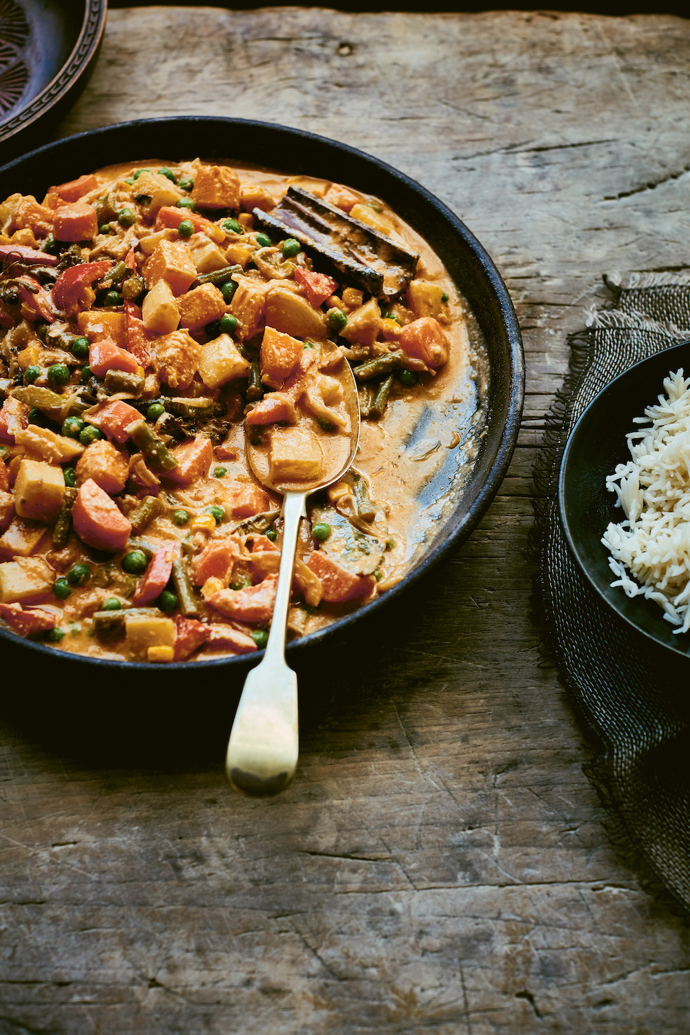 Navratan is a traditional South Asian style of gem-setting based on nine different precious stones. This korma is made up of nine colourful vegetables. It’s a great way to use up odd veg from your fridge. Try red, yellow and orange peppers, aubergine, courgettes, baby sweetcorn, mangetout, cabbage and spinach. Or you could par-boil some carrots, parsnips, potatoes, French beans and pumpkin, then add red pepper, peas, sweetcorn and purple sprouting broccoli. A comforting, creamy (and extremely nutritious) curry that is ideal for children, too!