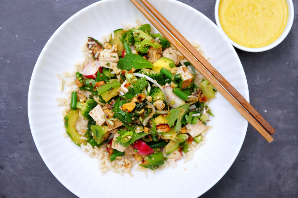 Divide the rice between your bowls, top with the mixed salad. Sprinkle the seeds over the top and added coriander. Drizzle any remaining marinade over the top. Serve with the carrot sauce.