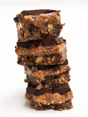 Lastly melt the chocolate and the coconut oil carefully in a small pan then poor into the tin, spread evenly and sprinkle with salt. Place back in the freezer for 30 minutes. Cut into squares and serve. Keep in the fridge covered for a week.
