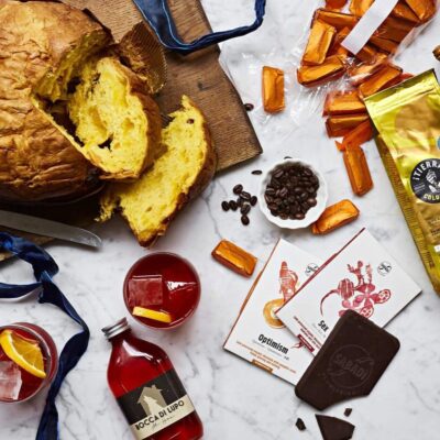 Bocca di Lupo’s hamper takes you on a roadtrip around Italy. There’s fluffy pannetonne from the Amalfi coast, coffee roasted in Gattinara, Sex and Optimism chocolate bars cold-pressed in Sicily, Giandujotti caramels from Piedmont, plus the classic Bocca di Lupo Negroni for 2 to pour over ice. £63. Order here.
