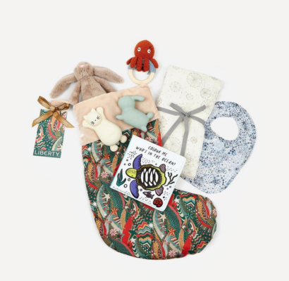 A gorgeous Liberty print Little Star stocking stuffed with presents for Christmas babies from the softest Jellycat Bashful bunny to bath toys, rattles, swaddles and a cotton bib. £80 (with contents worth over £133). Order here.
