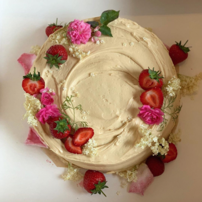 I most enjoy making summer birthday cakes. I think one of my favourites has to be an elderflower and strawberry cake. Elderflower I adore, I think it’s a magical flavour and anyone can find it in the hedgerows. So lashings of elderflower cream with the perfectly ripe British strawberries in layers of oh-so-light chiffon sponge, and knowing me, covered in colourful blooms. A complete dream!