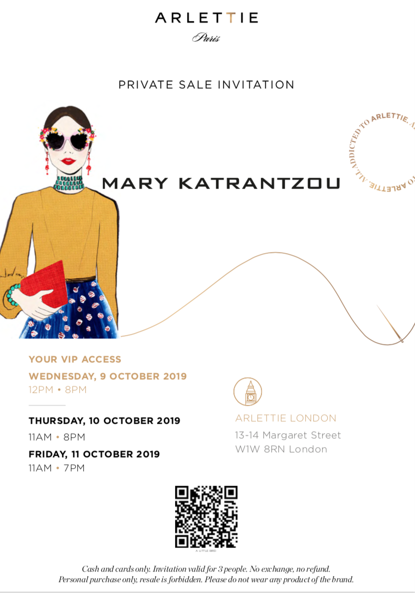 So we’re thrilled to say that we’ve teamed up with French Sample Sale Company Arlettie to give A Little Bird readers VIP access to the Mary Katrantzou sample sale (if you can’t see the invitation below, click here). VIP access is from midday – 8pm on Wednesday 9th October (and you can always join the general public on Thursday 10th and Friday 11th October too). Happy Shopping!