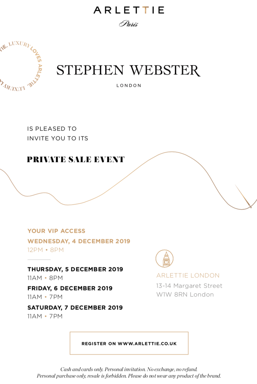 If a piece of fine jewellery is on your Christmas wish list then don’t miss this Stephen Webster Sample Sale at Arlettie where prices start from £100. One of London’s top jewellers, Stephen Webster MBE, has a long list of celebrity clients: from Elizabeth Taylor to Madonna (he made the wedding rings for her and Guy Ritchie) and from Ozzy Osborne to Sir Elton John. So whether you are looking for a pair of earrings from his iconic Crystal Haze collection or a diamond band ring, you can be first in the queue as A Little Bird readers get VIP Access from midday – 8pm on Wednesday 4th December as well as general access to the sale from Thursday 5th – Saturday 7th December (all details on the invitation below. If you can’t see it, please click here).